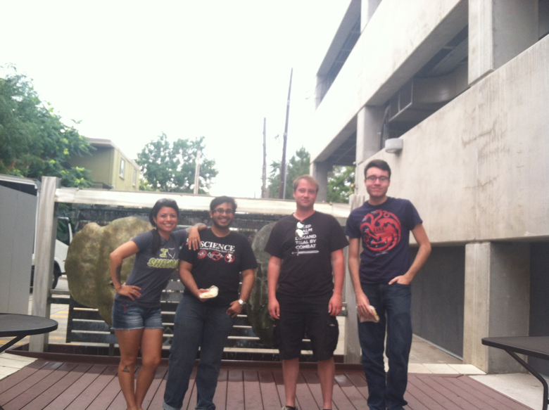 I'll be the short Indian guy with glasses wearing a t-shirt that includes one or all of these themes: the word Science, Robots, or Dinosaurs.