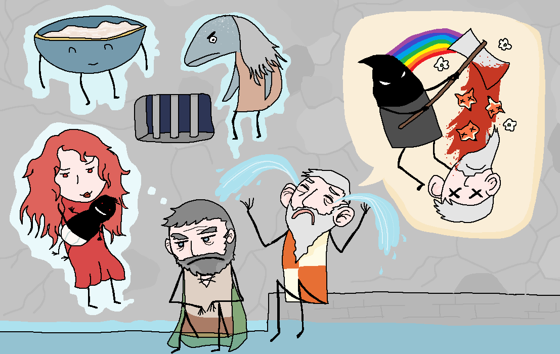 Davos thinks about his gaolers, Porridge and Lamprey and also of Melisandre's visit to him and her not very subtle offer of making shadowbabies with him. Alester Florent cries.